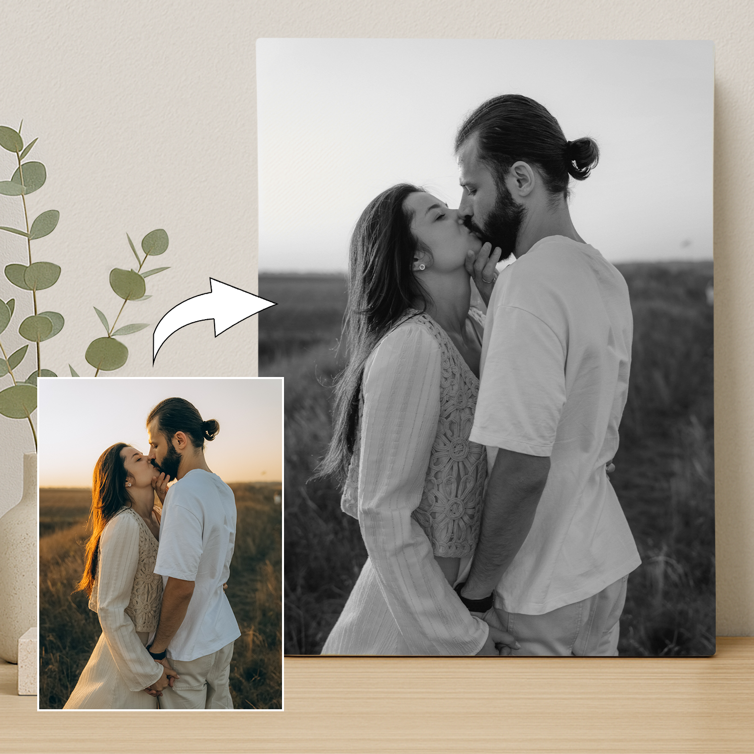 Halte die schönsten Emotionen in einer Form fest, die niemals an Glanz verliert. Dieser personalisierte Leinwanddruck verwandelt euer gemeinsames Foto in ein einzigartiges Porträt, das nicht nur zur stilvollen Dekoration wird, sondern auch ein Symbol von Liebe und Nähe ist.
